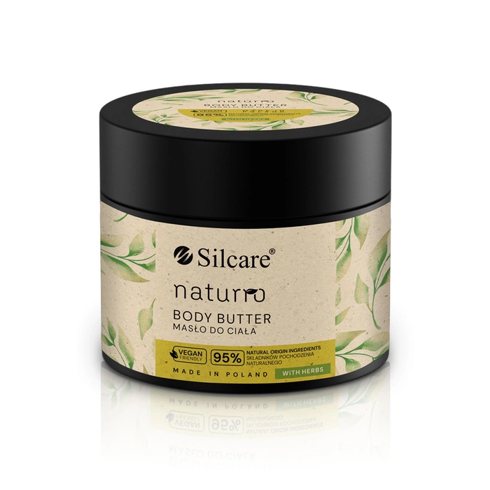Silcare naturro Body Butter to wegańskie masło do ciała oparte w 95% na składnikach pochodzenia naturalnego. Jest bogate w masło Shea oraz oleje makadamia i z pestek brzoskwiń, które pomagają nie tylko przywrócić skórze ciała jedwabistą miękkość i gładkość, ale też działają łagodząco. Zawiera również witaminy E, A, prowitaminy B5, B7, B8, a także kwasy omega-3 i omega-8 oraz fitosterole. Składniki te głęboko odżywiają, silnie nawilżają oraz pomagają zregenerować i utrzymać prawidłowy poziom nawilżenia skóry, dzięki czemu nabiera ona blasku, staje się jędrniejsza, wizualnie zdrowsza i odmłodzona. Silcare naturro Body Butter pozostawia ochronną warstwę, która zabezpiecza skórę przed niekorzystnym działaniem czynników zewnętrznych. Orzeźwiający owocowo-ziołowy aromat masła uprzyjemnia pielęgnację, kojąc przy tym zmysły.