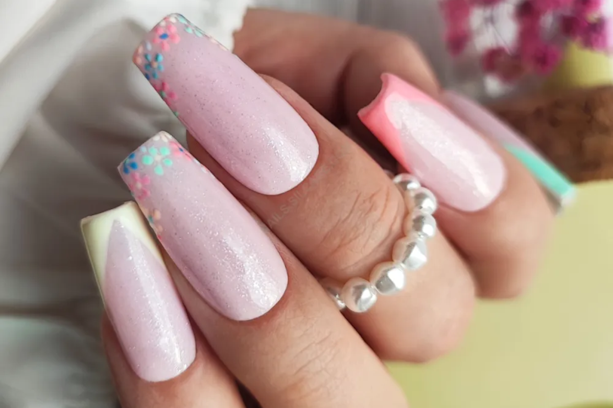 Wenn Sie zwei Farbtöne auswählen, die für Ombre-Nägel benötigt werden, lassen Sie Ihrer Fantasie freien Lauf und lassen Sie sich von Ihrem Sinn für Stil leiten. Denken Sie daran, dass das Schattieren nicht nur aus einem Farbduo bestehen muss. Sie können beliebige Akzente in Ihr Ombre einweben, wie Dekorationen, Glitzer, Folien, Muster, Aufkleber oder (jetzt sehr im Trend) getrocknete Blumen.