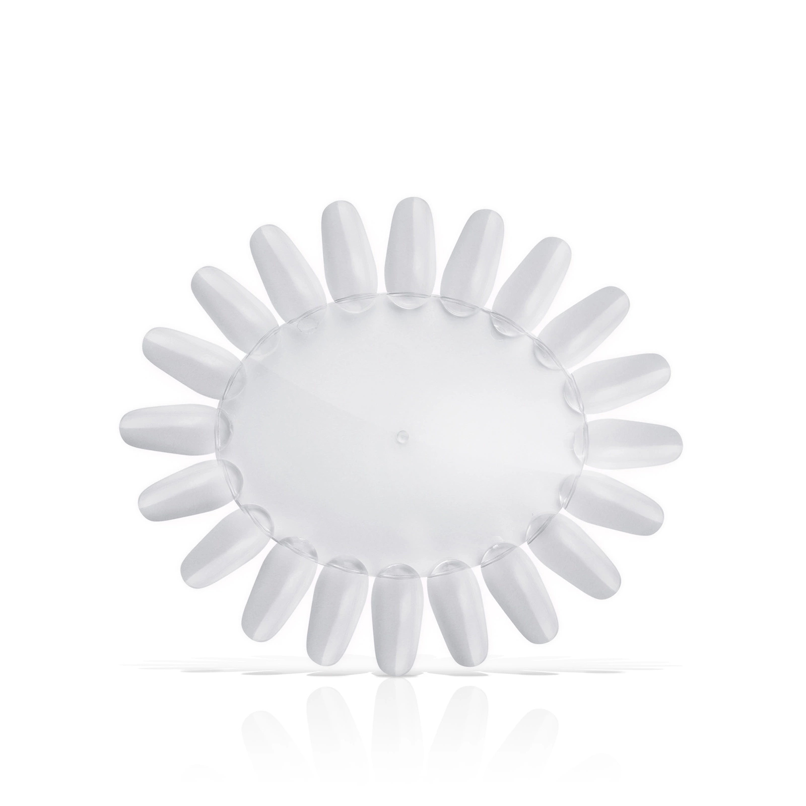 Eine transparente Vorlage für die Präsentation von Farben von Hybridlacken, Gelen und Dekorationen. Das Display hat 20 runde Spitzen. Unverzichtbar in jedem Schönheitssalon.