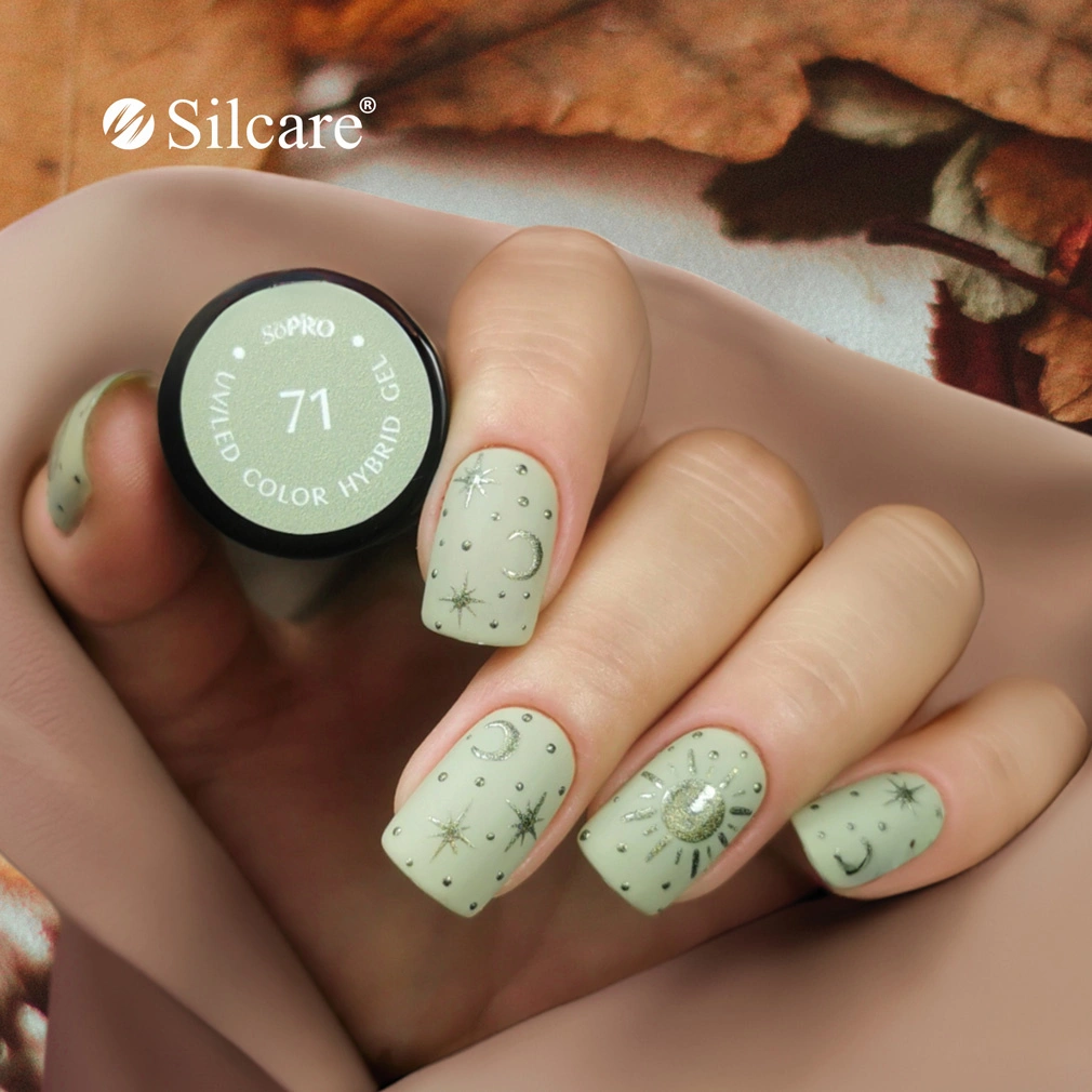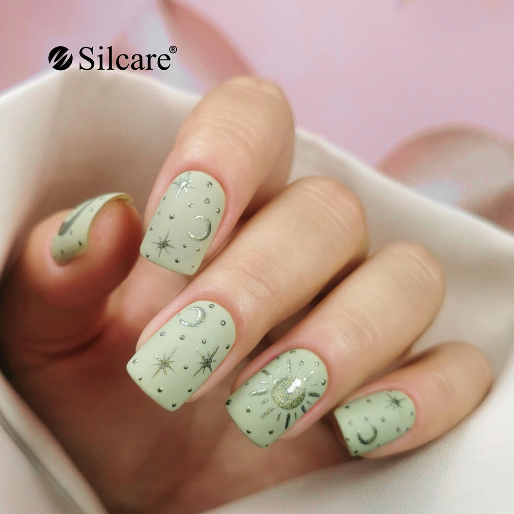 Verzierungen in Form von Sternen, Monden und dezenten Punkten verleihen dem Design einen magischen, kosmischen Charakter. Die olivgrüne Farbe mit mattem Finish ist ein Trendsetter in der herbstlichen Nagelmode, während die kosmischen Motive ihnen Einzigartigkeit und Geheimnis verleihen.