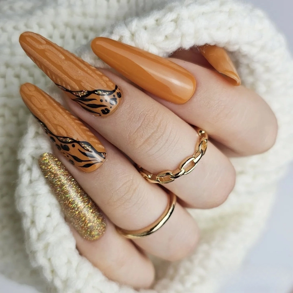 Karamell-Nägel begeistern mit ihrer warmen Braun- und Orangetönung, die den Händen einen gemütlichen Charakter verleiht. Das Styling kann einheitlich und minimalistisch sein oder mit Verzierungen wie Animal-Prints, Glitzer oder Strickmuster ergänzt werden. Dadurch gewinnt die Maniküre an Vielfalt und Originalität.
