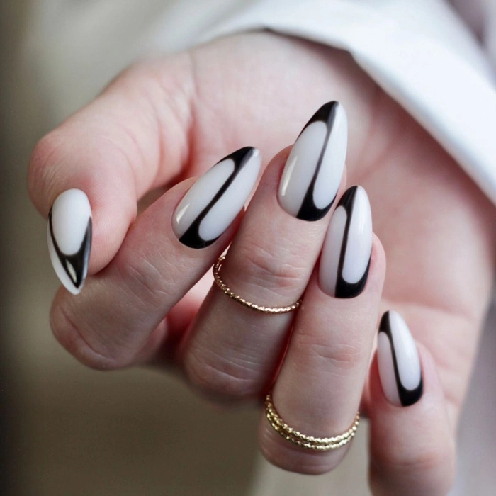 Schwarz-weiße Nägel sind eine hervorragende Wahl für Frauen, die klassische Eleganz in modernem Gewand mögen. Diese Maniküre passt zu verschiedenen Nagelformen und harmoniert wunderbar mit minimalistischen Schmuckstücken.