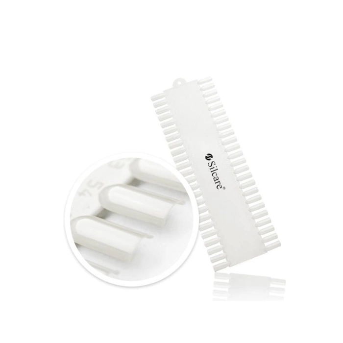 Rectangle shape chart is made of high quality plastic. Perfect for the presentation of classic styling and decorations on the nails, made by lacquer, acrylic or gel. Does not deform in UV light. Practical, esthetic and functional.