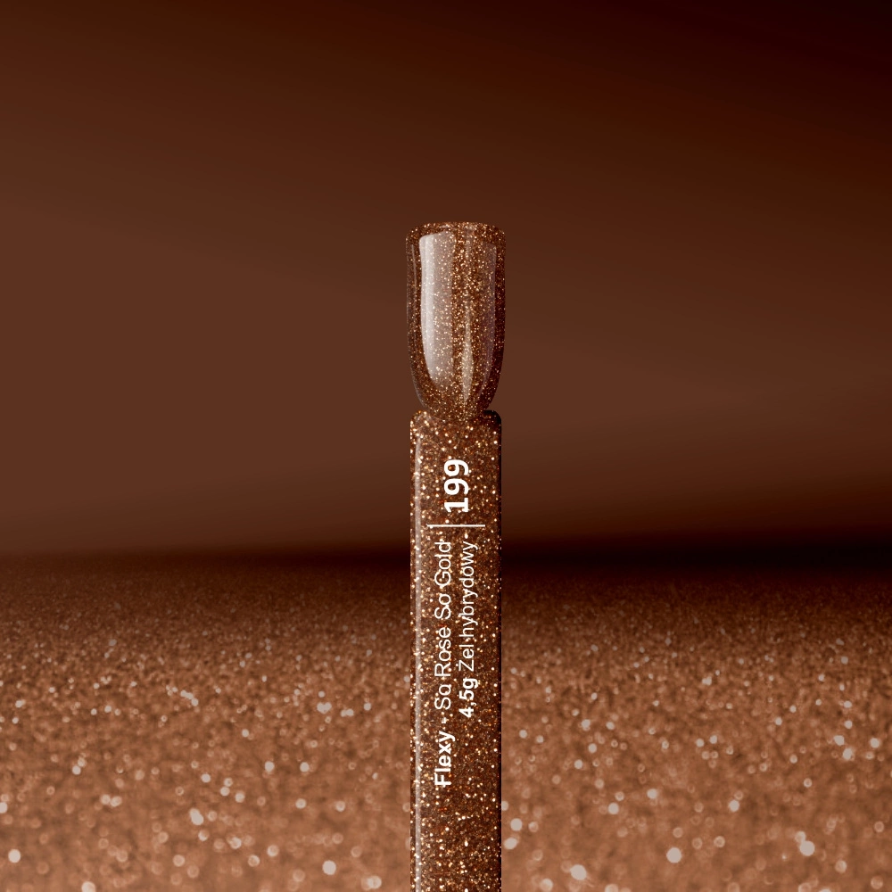 Looking for a color that combines warmth, elegance, and a touch of sweetness? Flexy 199 So Rose! So Gold! Caramel Glaze 4.5 g hybrid nail polish is a deep caramel-brown shade with subtle golden shimmer. This hybrid nail polish looks like liquid gold sealed in a bottle!