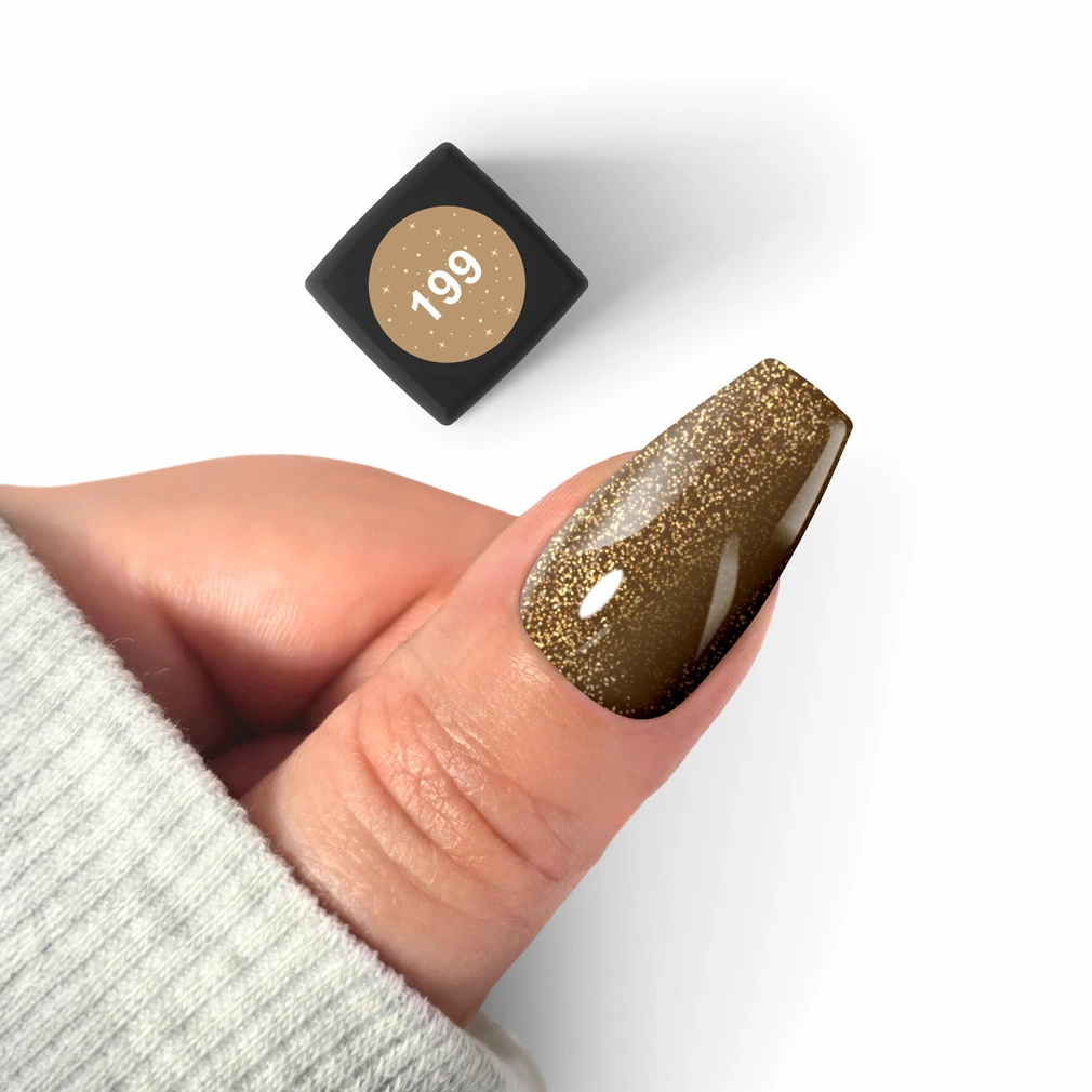 Flexy 199 Caramel Glaze impresses not only with its color but also with its formula. The silky texture allows the hybrid nail polish to spread smoothly without streaks, forming an even, glossy layer. The golden particles reflect light beautifully, emphasizing the shape of hybrid nails and adding depth to the styling.