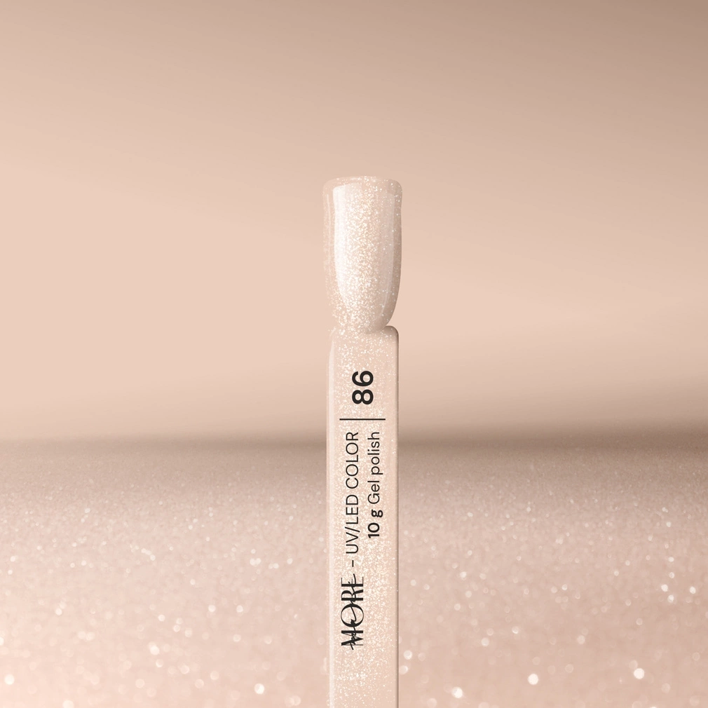 maniMORE hybrid polish *86 is a sophisticated champagne glitter shade with bubbles – the perfect color for a romantic autumn date at your favorite restaurant. It’s a unique shade that brings a luxurious vibe right to your fingertips.
