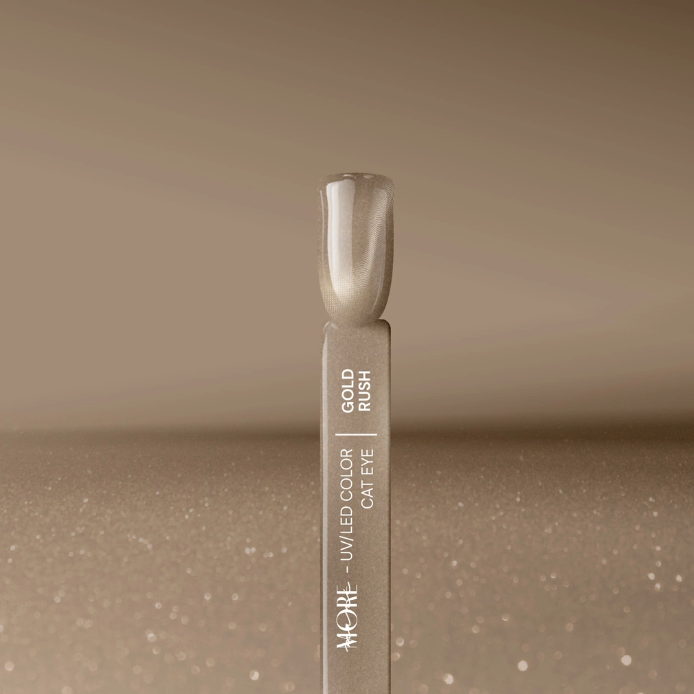 Cat’s eye effect is one of the trendiest looks in hybrid manicure. In the magnetic maniMORE collection, you will find 4 eye-catching shades: PINK CRUSH, GOLD RUSH, BLUE SNAP, and SILVER POP. The hybrid nail polish with magnetic particles creates a subtle cat’s eye effect.