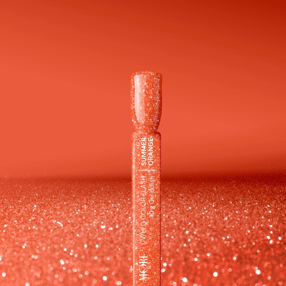 SUMMER FLASH ORANGE – an exciting hybrid nail polish that takes you straight to a summer beach. The intense orange shade reflects the warmth of the summer sun, while the sparkling particles add elegance and shine. This shade is a perfect choice to emphasize the summer vibe and add energy to any styling.