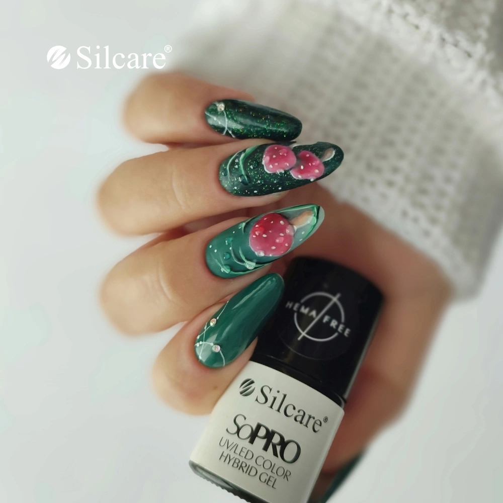 Natural inspirations perfectly align with autumn manicure trends, while the hand-painted toadstools attract attention and add depth to the look. The combination of deep green with red accents beautifully reflects the autumn atmosphere, making this design ideal for the season—from forest walks to cozy evenings by the fireplace.