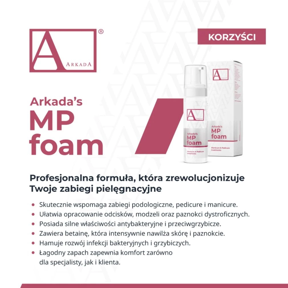 La MP Foam di Arkada per pelle e unghie offre, grazie alla sua consistenza, un'azione duratura sulla superficie della pelle e delle unghie. È possibile trattare efficacemente e con precisione calli, duroni e unghie distrofiche, rendendo molto più semplici i trattamenti di manicure e pedicure!