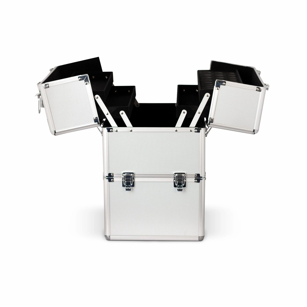 Un elegante baule a tre livelli per accessori cosmetici: il argento grezzo è molto spazioso. Si adatta a una fresatrice, una lampada, cosmetici e prodotti per lo styling delle unghie. La parte superiore, ribaltabile, è dotata di due cassetti su entrambi i lati. Gli scaffali ospiteranno vernici alte 8,5 cm. La parte inferiore della valigetta è fissata con fermi, così puoi facilmente cambiare la valigetta a tre livelli in una valigetta a due livelli. I raccordi in alluminio aumentano la durata. Gli strass lucidi sono una decorazione bella ed elegante. Inoltre, il bagagliaio può essere bloccato con una chiave.
