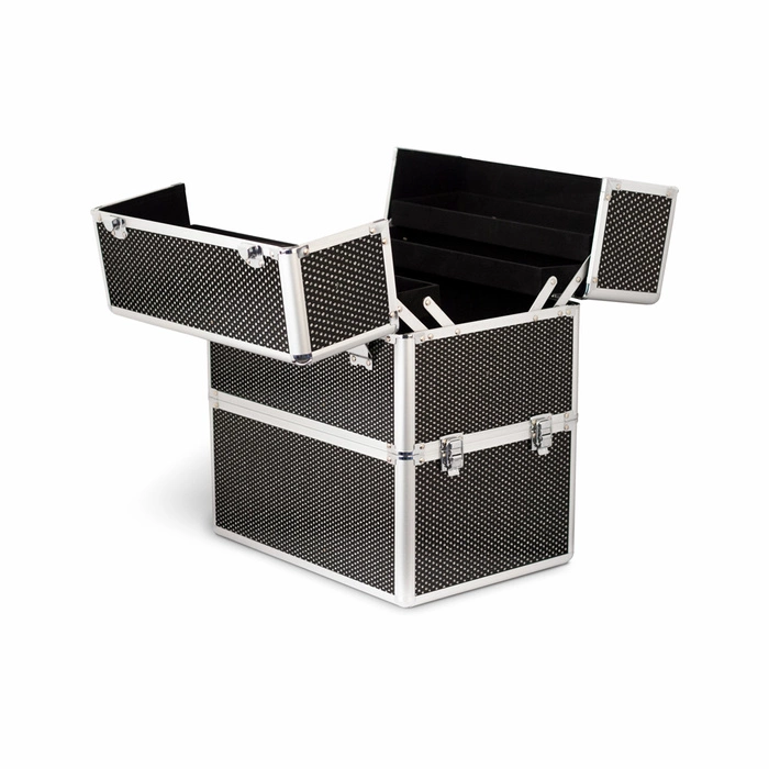 Pettorale retrò a tre livelli per accessori cosmetici: gli strass neri lucidi sono molto spaziosi. Si adatta a una fresatrice, una lampada, cosmetici e prodotti per lo styling delle unghie. La parte superiore, ribaltabile, è dotata di due cassetti su entrambi i lati. Gli scaffali ospiteranno vernici alte 8,5 cm. La parte inferiore della valigetta è fissata con fermi, così puoi facilmente cambiare la valigetta a tre livelli in una valigetta a due livelli. I raccordi in alluminio aumentano la durata. Gli strass lucidi sono una decorazione bella ed elegante. Inoltre, il bagagliaio può essere bloccato con una chiave.