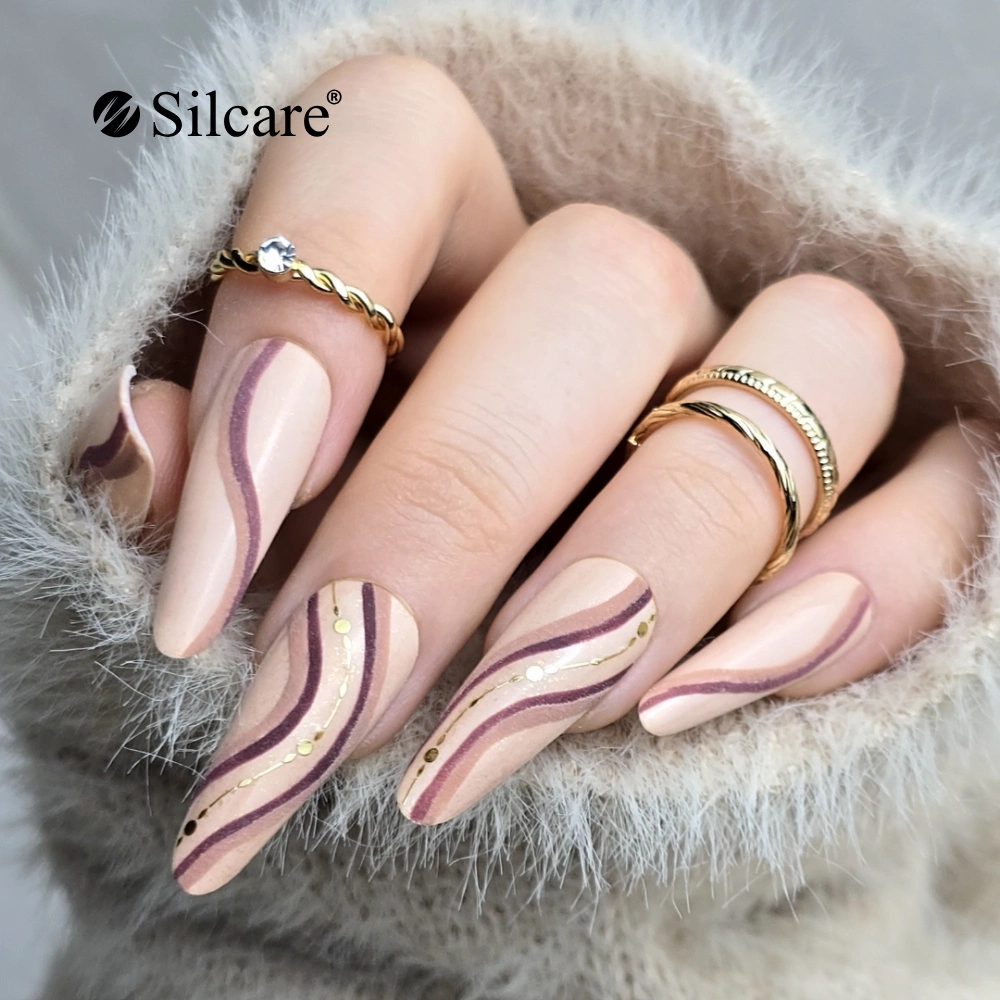 Una nail art ispirata a calde note di cannella e alla delicatezza dei cornetti di San Martino è una combinazione unica di colori avvolgenti ed eleganza. Una base neutra color beige esalta la raffinatezza della manicure, mentre le linee ondulate in marrone cannella e oro donano un carattere deciso alle unghie. Le decorazioni con piccoli accenti dorati aggiungono un tocco di lusso, perfetto per l’atmosfera autunno-invernale.