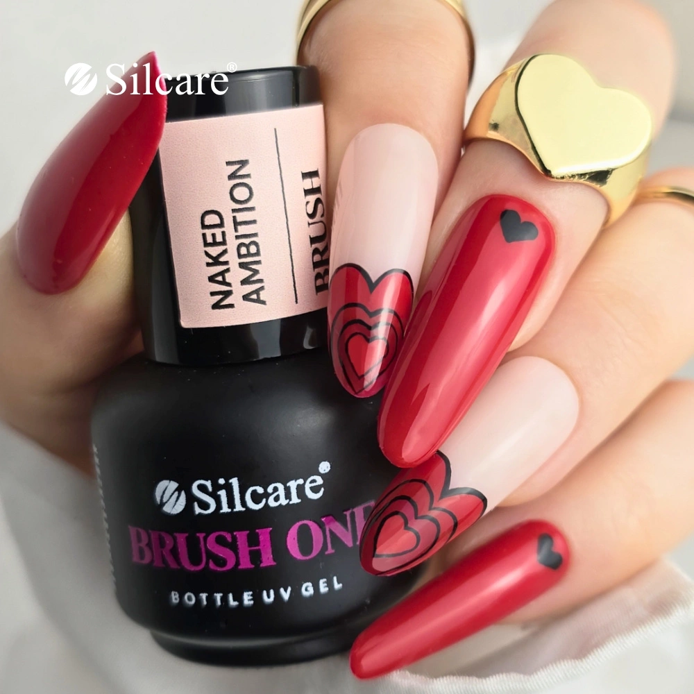 La base di questo look è il semipermanente rosso di Silcare, che garantisce un colore intenso e una durata impeccabile. Gli eleganti cuori neri e rossi donano carattere alle unghie, e grazie ai pennelli di precisione per nail art puoi ottenere questo effetto con facilità.