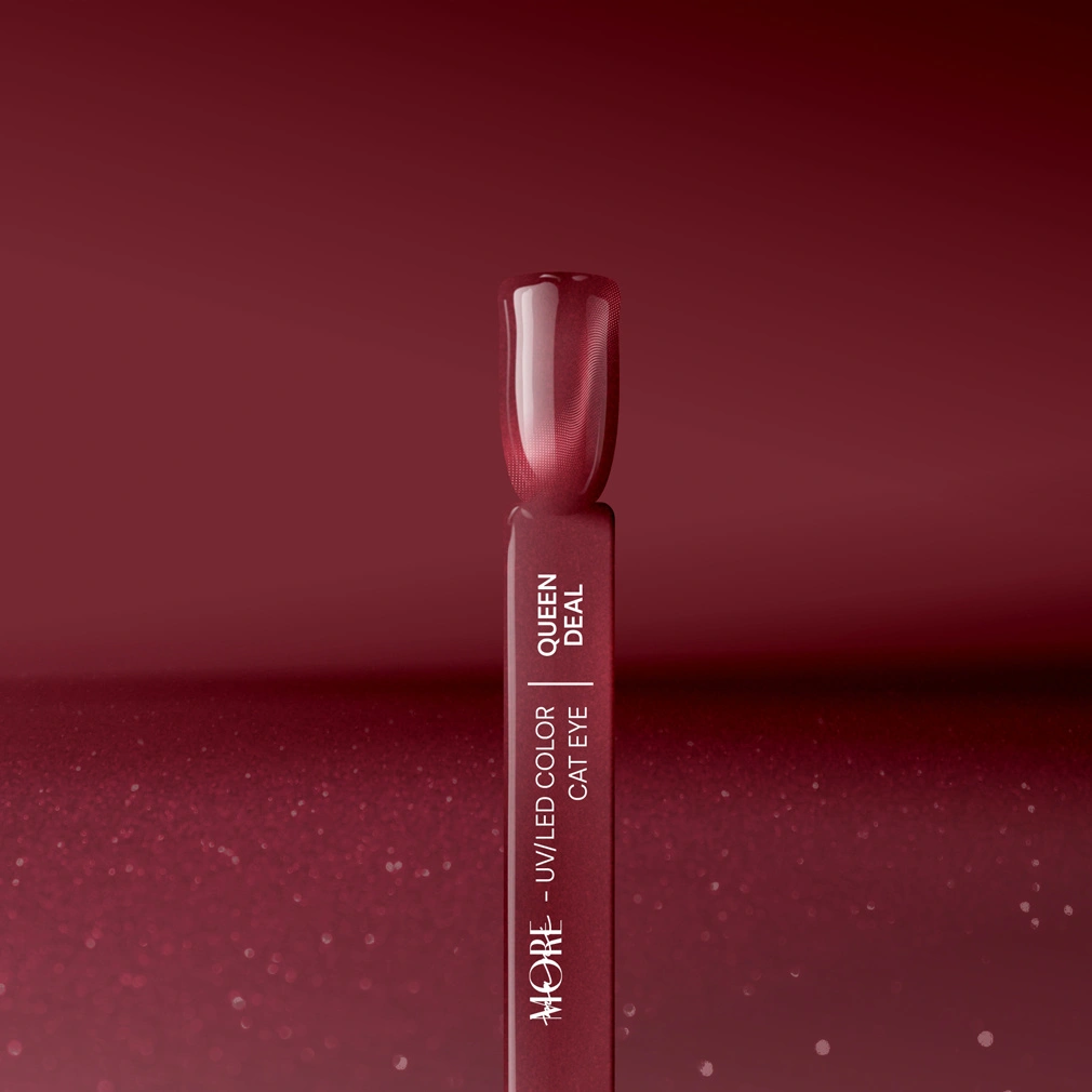 Queen Deal è uno smalto ibrido cat eye che non scende a compromessi. È una tonalità intensa di bordeaux con un riflesso magnetico tridimensionale che crea l’effetto occhio di gatto sulle unghie. Elegante, deciso, lussuoso. Ideale per le donne che giocano sempre al massimo e sanno che la sicurezza inizia dalle mani.