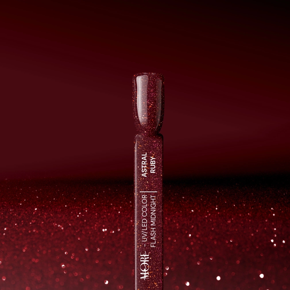 ManiMORE Midnight ASTRAL RUBY Flash è una nuova versione del rosso intenso con fine glitter rosso, verde e dorato.