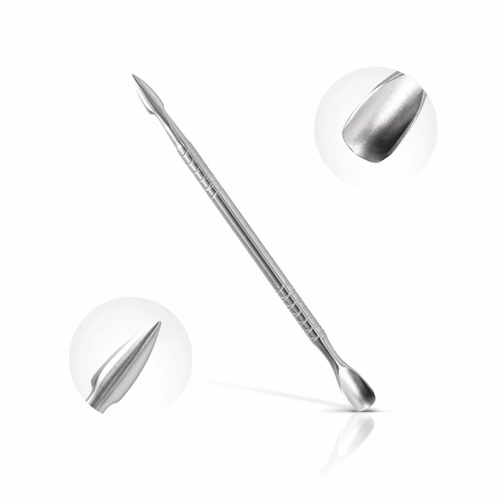 Rullo per cuticole satinato: uno strumento professionale per spingere indietro e rimuovere le cuticole utilizzato nei trattamenti di manicure e pedicure, realizzato in acciaio inossidabile di alta qualità. Il rullo ha due estremità: una spatola arrotondata per spingere indietro le cuticole e una spatola piatta e appuntita per rimuoverle. Una comoda impugnatura antiscivolo dalla forma ergonomica garantisce un elevato comfort di lavoro e stabilità della presa. È adatto anche per applicare glitter e rimuovere ibridi.