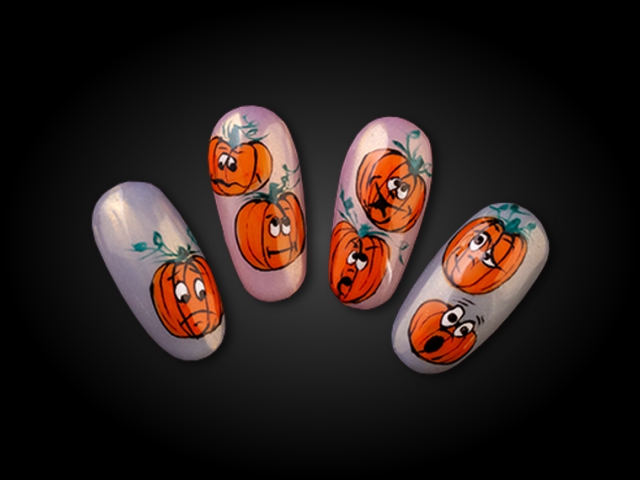 Przy pomocy Base One Paint Gel nr 19 dorysowujemy dyniom usta i brwi, po czym utwardzamy paznokcie w lampie przez 30 sekund.