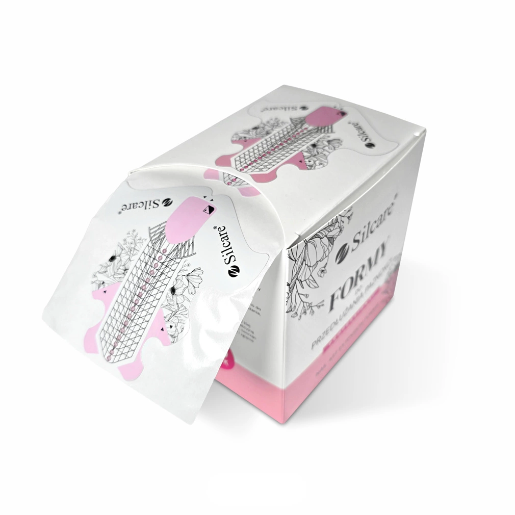 Formy są pakowanie w poręczne kartoniki po 100 lub po 500 sztuk, dzięki czemu szablony utrzymują swój kształt, nie ulegając zaginięciom. Szablon posiada linie perforowane umożliwiając skrócenie formy pod krótkie paznokcie. Linie pomocnicze pomagają precyzyjnie dopasować formy do płytki i modelować różne kształty paznokci.