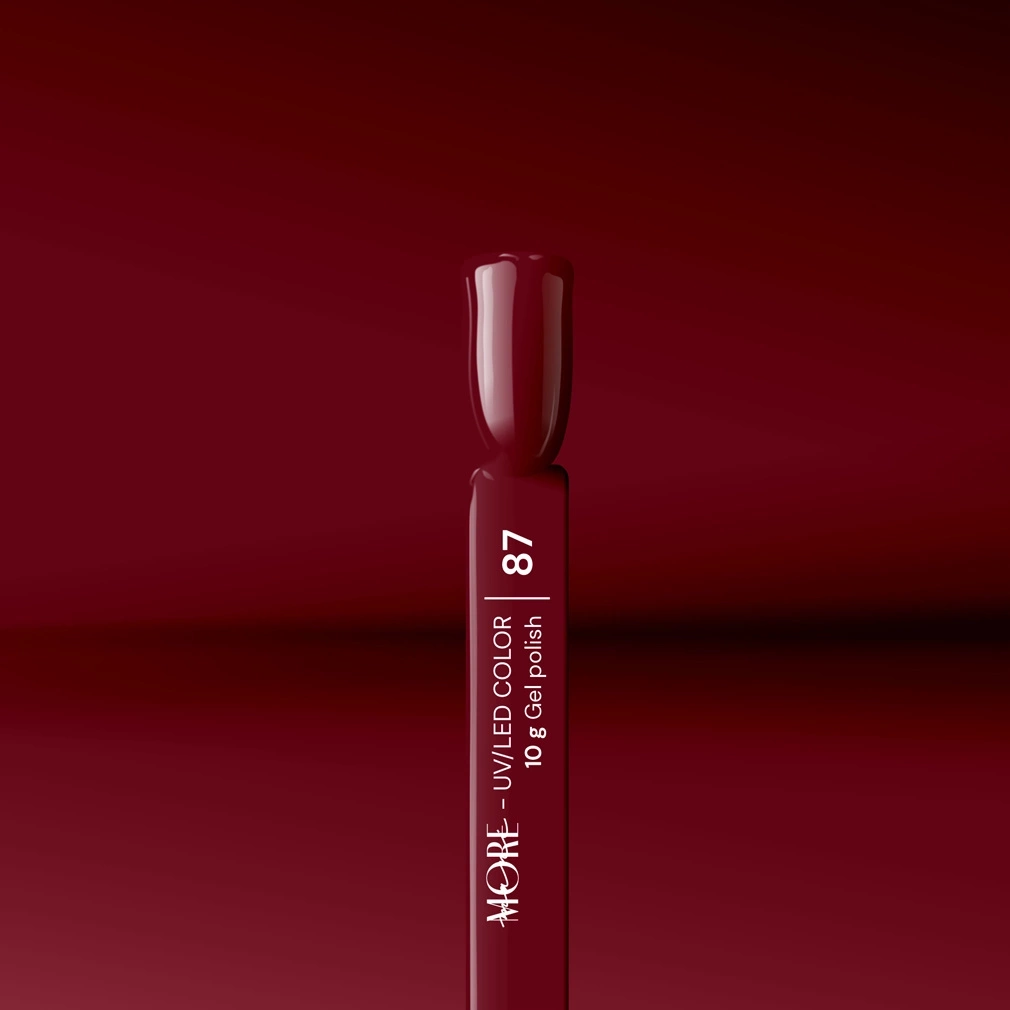 Lakier hybrydowy maniMORE 87 to fascynująca burgundowa czerwień, która niemalże od razu przywodzi na myśl lampkę czerwonego wina. Tę, po którą sięgasz na eleganckiej, romantycznej kolacji, kiedy celebrujesz Walentynki wraz z ukochanym. Seksowna, tajemnicza i budząca wspomnienia.