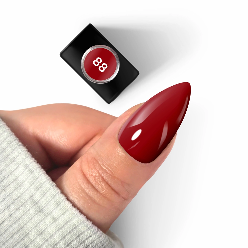 Lakier hybrydowy maniMORE 88 to mocna, rubinowa czerwień. Kojarzy się z klasycznym sercem w nasyconym odcieniu. Kolor idealnie walentynkowy, szlachetny i wyraziście przyjemny dla oka!