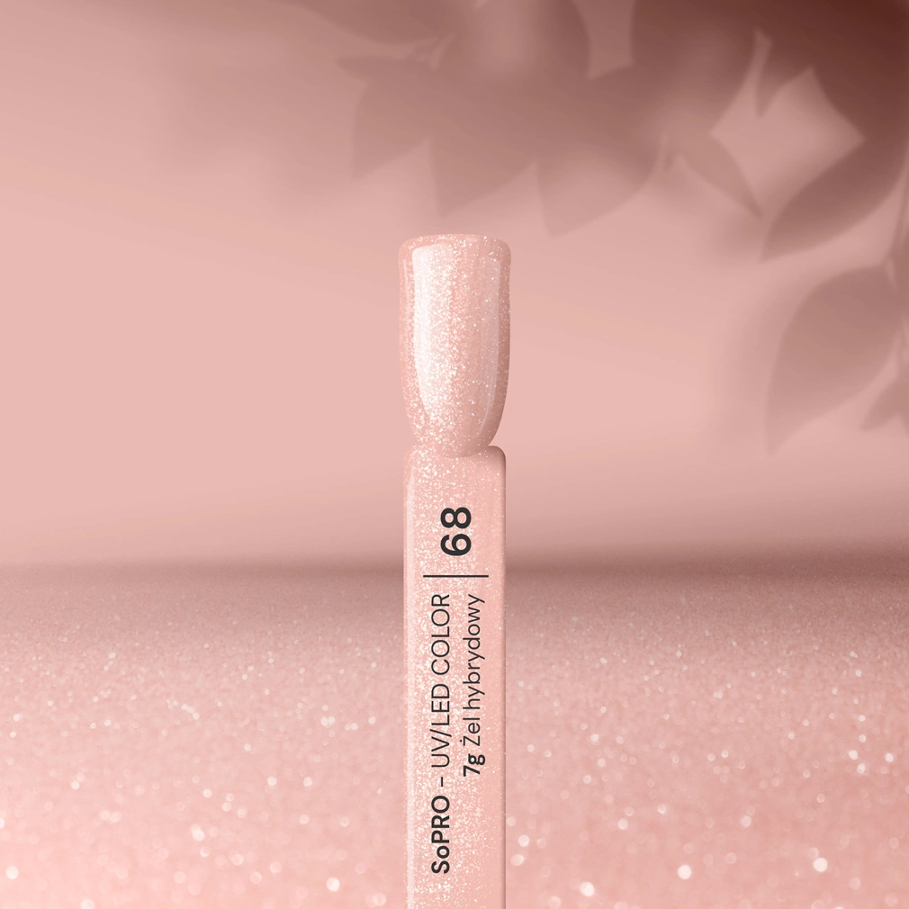 Lakier hybrydowy soPRO *068 to wystrzałowy odcień szampana z gęstym brokatem, perfekcyjny dla kobiet, które pragną rozświetlić jesień i szykują się na niezwykłe okazje, romantyczne randki lub spotkania z eleganckim dress-codem. Obok tego koloru i takiego wykończenia nie da się przejść obojętnie!