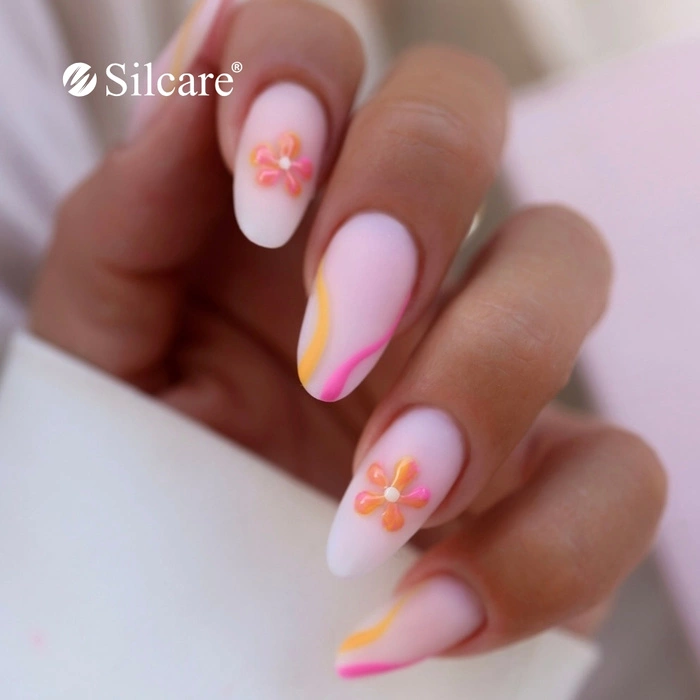 W drugiej połowie lata paznokcie mogą zyskać świeży i radosny charakter dzięki pastelowym odcieniom i subtelnym zdobieniom. Właśnie taki efekt oferują letnie paznokcie z kwiatkami, które łączą w sobie kobiecość, modny styl i odrobinę zabawy. Delikatna, matowa baza w kolorze baby pink została urozmaicona falującymi liniami w neonowym różu i żółci oraz ręcznie malowanymi kwiatkami w tym samym tonie. Całość tworzy harmonijną, wakacyjną kompozycję, która świetnie sprawdzi się zarówno na co dzień, jak i na plażowe wyjazdy.