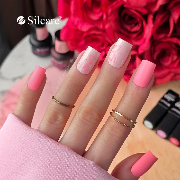 - Pokryj paznokcie różowym lakierem hybrydowym – użyj jaśniejszego odcienia na środkowy i serdeczny palec.