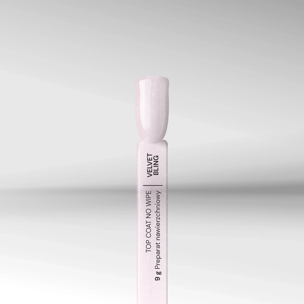 Na warstwę przezroczystej bazy nałożyć Velvet Bling Top Coat, po czym utwardzić w lampie UV/LED o minimalnej mocy 48W przez 60s
